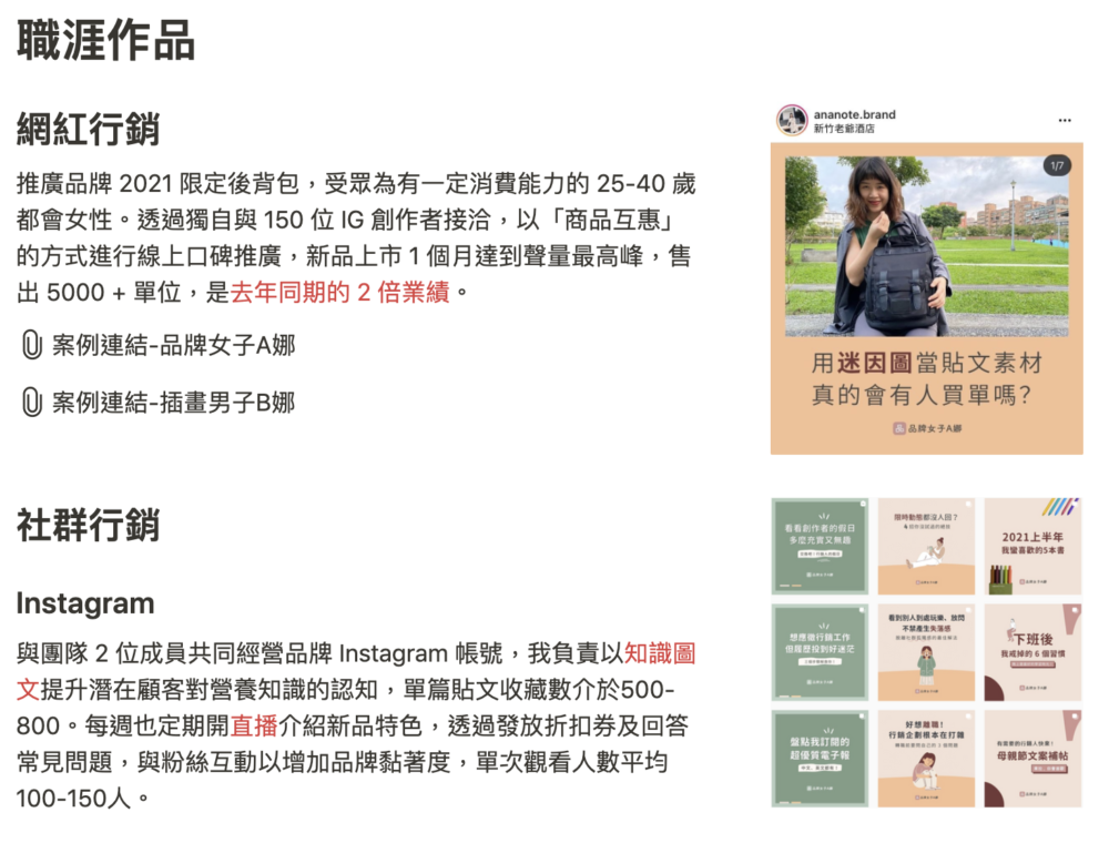 假使你的經歷沒辦法整份搬到作品集中,如:好幾十頁的活動企劃、自媒體社群平台或是聲音/影片作品,可以在作品集裡放超連結,引導面試官到相關頁面查看細節,才不會影響整份文件的易讀性。