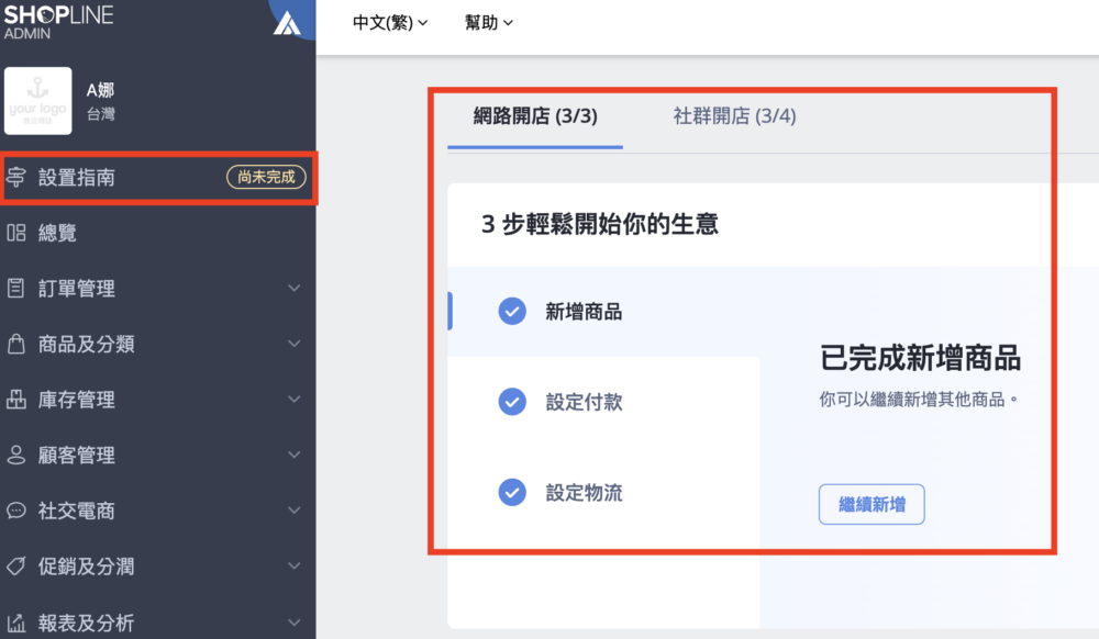 進入 Shopline 後台後,會發現功能非常多。這時別慌張!你可以點選左側欄的「設置指南」,按照平台提供的開店流程,就能順利完成基礎開店設定。