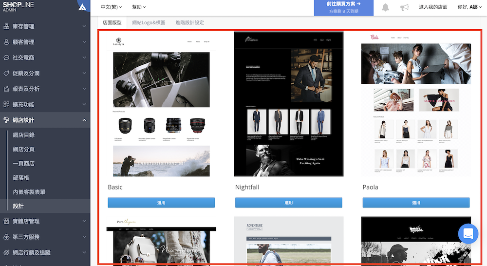 功能路徑:「網店設計 > 設計 > 店面版型」