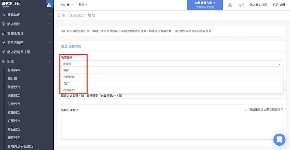 SHOPLINE 目前提供宅配(新竹物流、黑貓宅配)、超商取貨(7-11 統一超商、FamilyMart 全家便利商店、萊爾富、OK 便利商店)和門市自取等出貨方式。